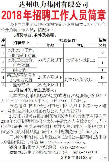 達州電力集團有限公司根據(jù)企業(yè)發(fā)展需要,現(xiàn)面向社會公開招聘工作人員